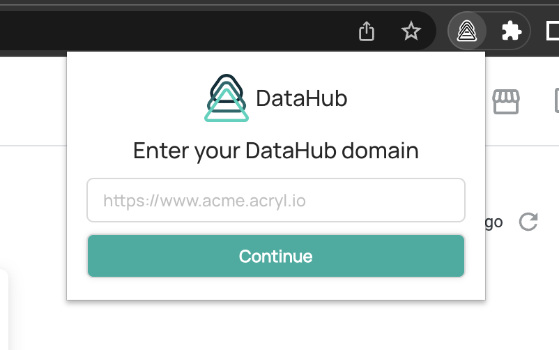 1. Fill in your DataHub domain and click "Continue" in the extension popup that appears.