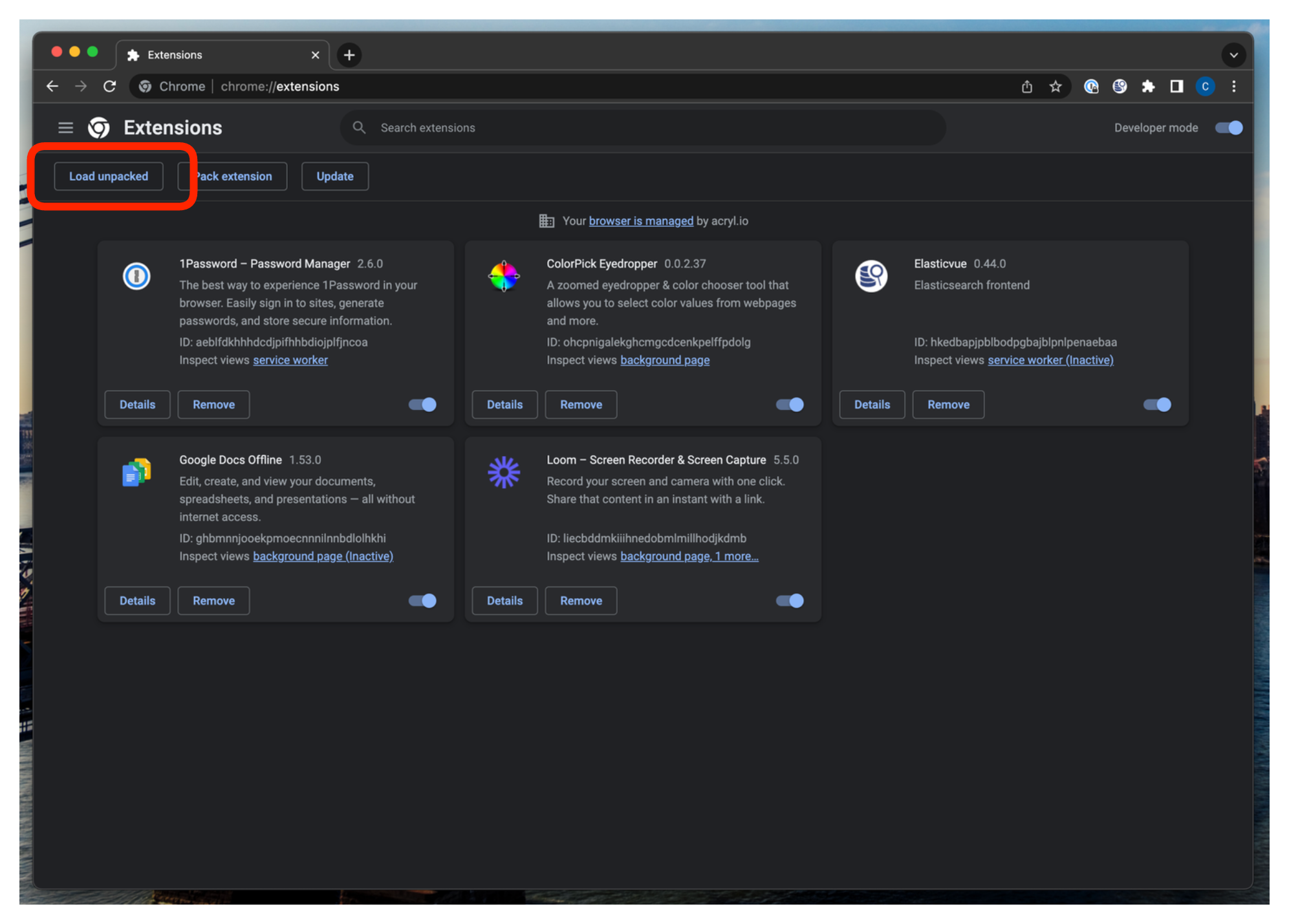 In order to use the Acryl DataHub Chrome extension before it's available on the Chrome store, you'll need to upload the same folder we're providing to the Chrome store on your own browser. The steps involved are: