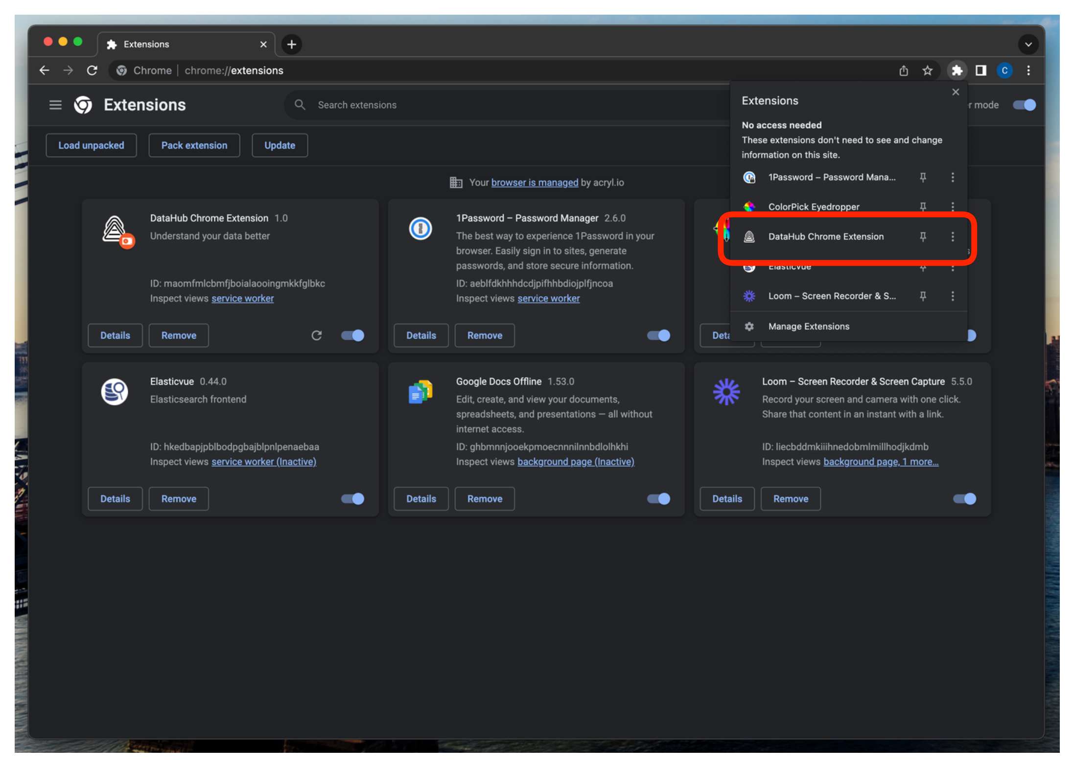 1. Click the extension button on the right of your browser's address bar to view all of your installed extensions. Click on the newly installed DataHub extension.